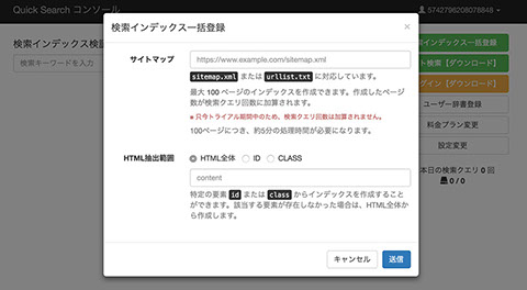 STEP ❸ 検索インデックスの一括登録検索対象となるサイトのsitemap.xmlまたはurllist.txtからインデックス作成します。